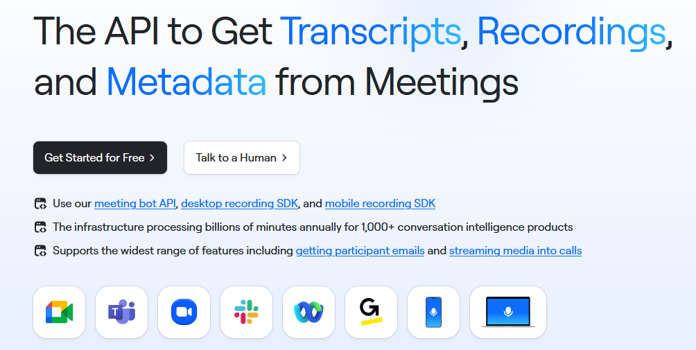 An universal API to capture and process real-time meeting data from major video conferencing platforms.
